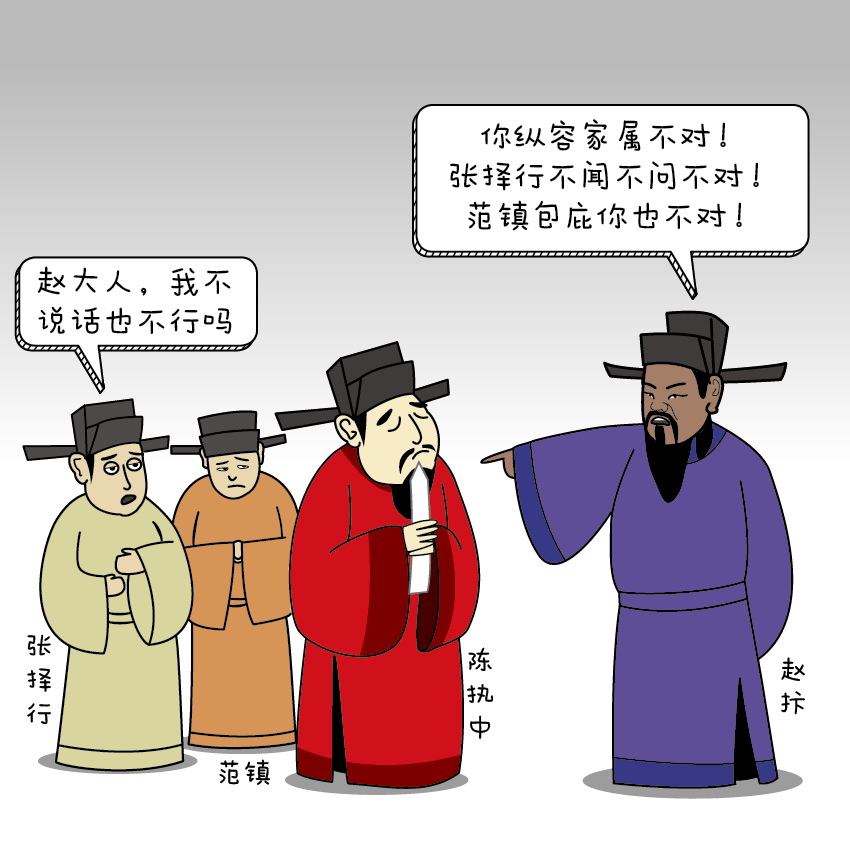宋史记载,宰相陈执中纵容家属殴打丫鬟致死,宋仁宗有意包庇,赵抃却先后上书二十多次要求对此严格执法并罢免陈执中。同时还弹劾了对此事不闻不问的谏官张择行和反对罢免陈执中的谏官范镇,并由此引起了与范镇长达一年多的论辩。最终结果是陈执中被贬,赵抃自身也被流放到外地。