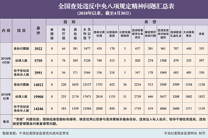 | 2018年4月全国查处 违反中央八项规定精神问题3922起 |